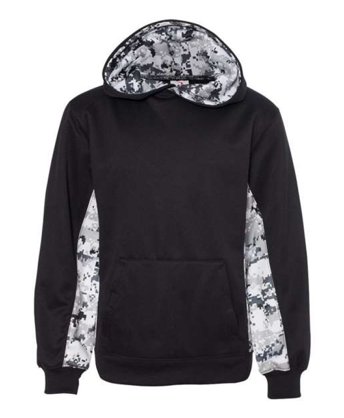 - Pouch pocket with two hook-and-loop closures at top of pockets with headset opening